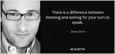 b.     In genuine listening, we tune into the other’s wavelength, we listen not just for what is being said but also for what is left unsaid, we listen not just to the words but for what might be the underlying needs and beliefs behind the words.